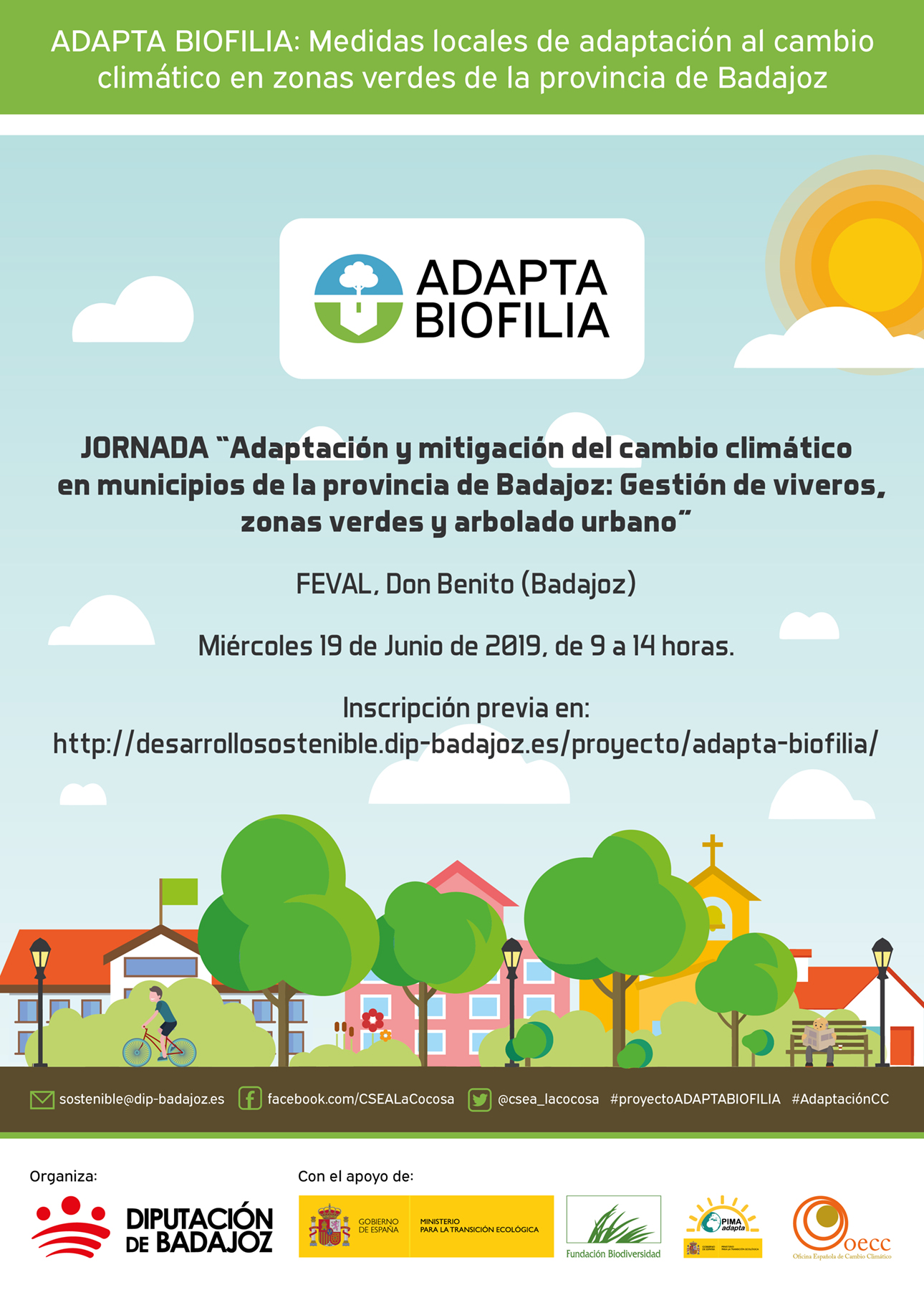 Esta Jornada se desarrolla en el marco del Proyecto ADAPTA BIOFILIA, desarrollado por el Área de Desarrollo Sostenible de la Diputación de Badajoz, con el apoyo de la Fundación Biodiversidad, del MITECO.