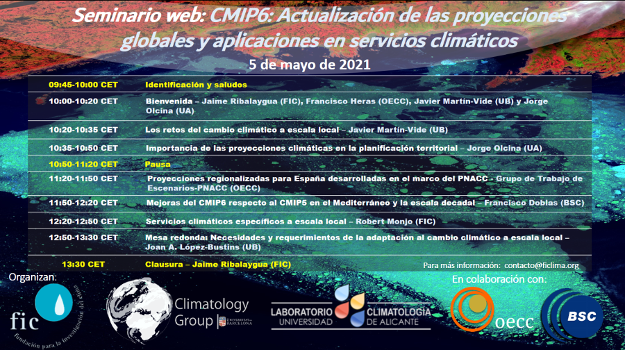 El 5 de mayo desde las 9:45 hasta las 13.:30 horas se celebrará el seminario web sobre la actualización de las proyecciones globables y aplicaciones en servicios climáticos organizado por la Fundación para la Investigación del Clima, el Grupo de Climatología de la Universidad de Barcelona y el Laboratorio de Climatología de la Universidad de Alicante y cuenta con la colaboración de la Oficina Española de Cambio Climático y el Centro Nacional de Supercomputación.