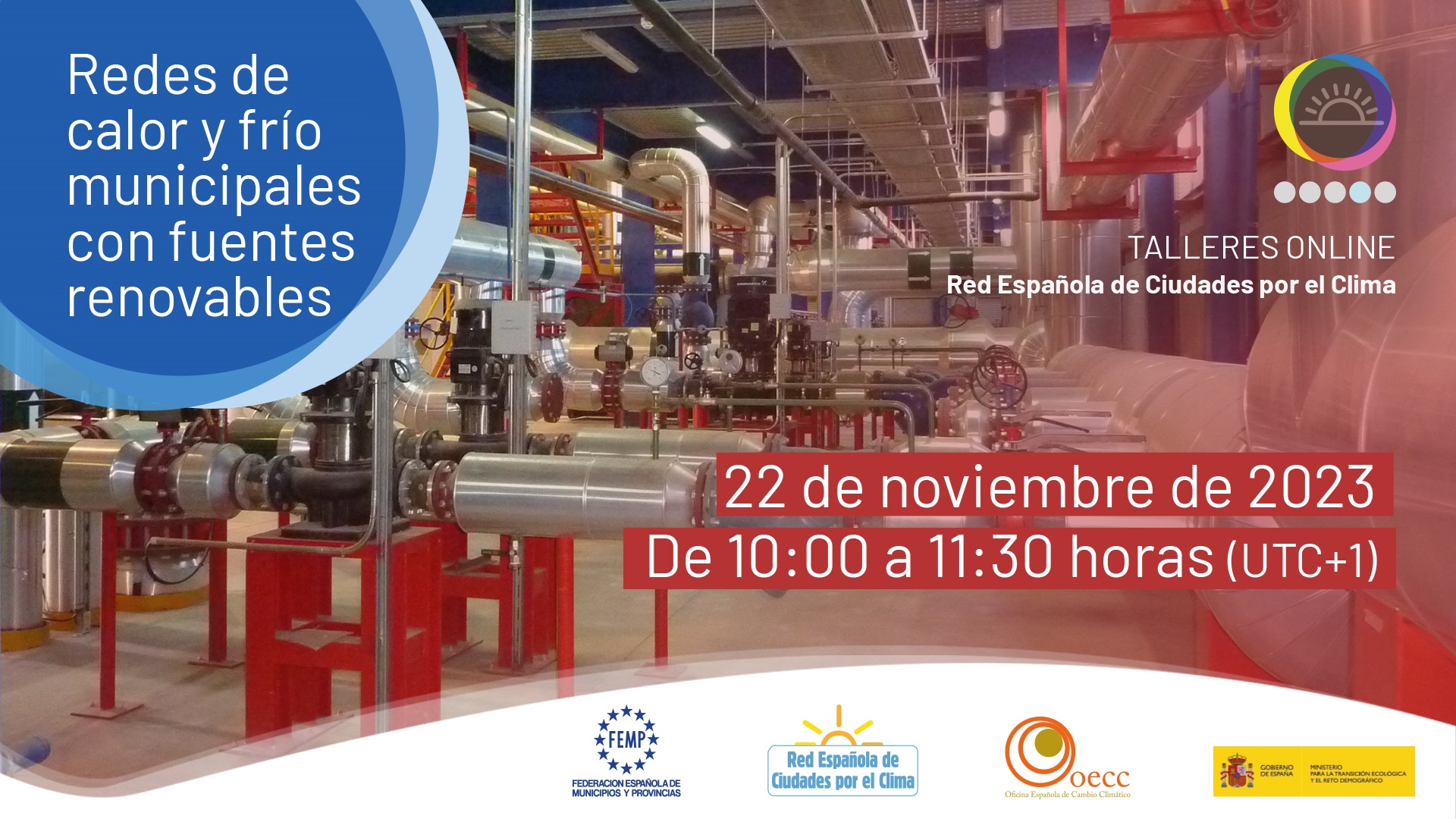 La Red Española de Ciudades por el Clima, en colaboración con la Oficina Española de Cambio Climático, continúa con el ciclo de talleres de Acción Climática. El próximo 22 de noviembre, de 10:00 a 11:30 horas (UTC+1), celebraremos el taller sobre Redes de calor y frío municipales con fuentes renovables, dirigido a responsables técnicos y políticos de la Red Española de Ciudades por el Clima.